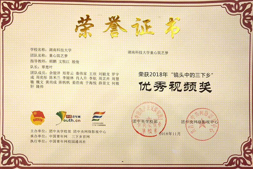 艺术学院“童心筑艺梦”实践团队在2018年“镜头中的三下乡”大学生志愿者暑期社会实践展示活动中,经层层遴选评审,获评“优秀视频奖”,成为湖南科技大学唯一获此殊荣的团队。在2018第三届全国大中专学生“三下乡”暑期社会实践公益传播力展示活动中,院党委副书记胡鹏荣获“优秀实践教师奖”。