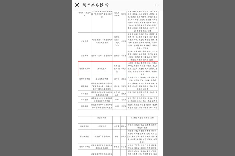 艺术学院童心筑艺梦实践团队在2018镜头中的三下乡大学生志愿者暑期社会实践展示活动中,经层层遴选评审,获评优秀视频奖,成为湖南科技大学唯一获此殊荣的团队。在2018第三届全国大中专学生三下乡暑期社会实践公益传播力展示活动中,院党委副书记胡鹏荣获优秀实践教师奖