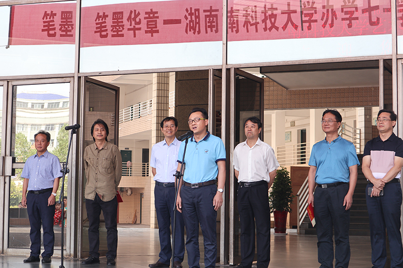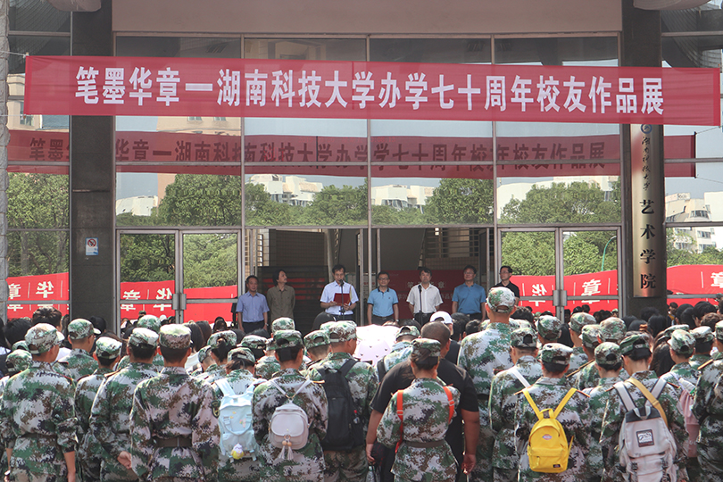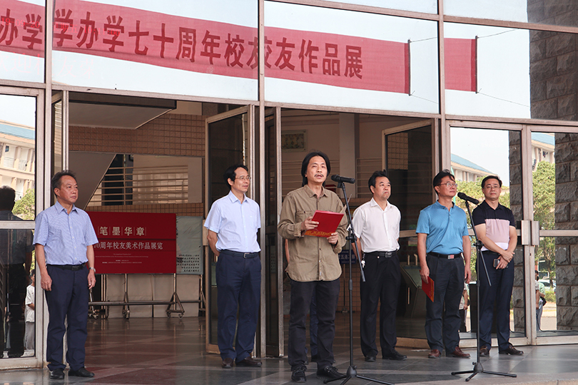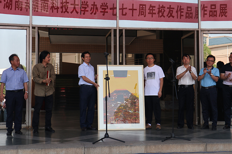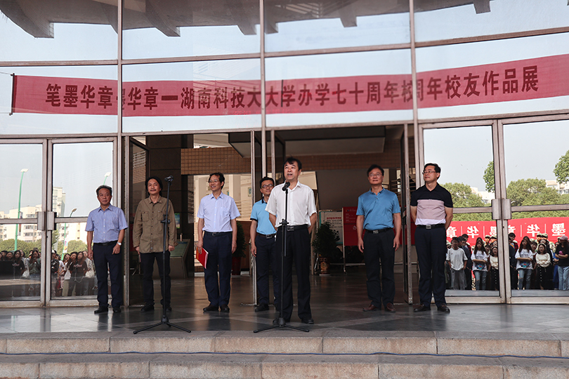 为深入贯彻习近平新时代中国特色社会主义思想,热烈庆祝中华人民共和国成立70周年暨湖南科技大学办学70周年,增强校友师生的凝聚感与归属感,9月20日上午9:58,笔墨华章——校友作品展在美术楼前坪隆重开幕,本次展览由湖南科技大学艺术学院、湖南科技大学校友办、湖南科技大学团委承办,湖南科技大学校长朱曲川、副校长胡石其、艺术学院院长李毅松、艺术学院党委书记曾志东出席本次开幕式,开幕式由胡石其主持。