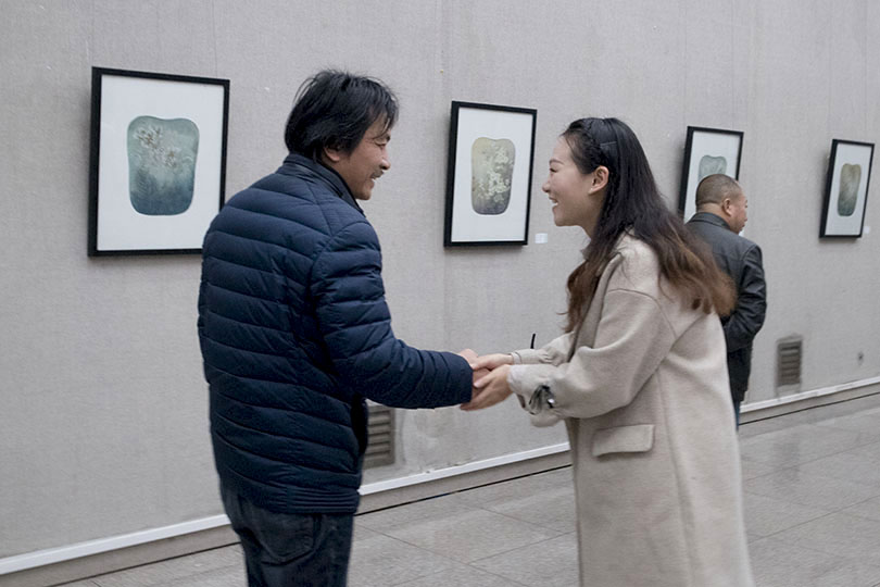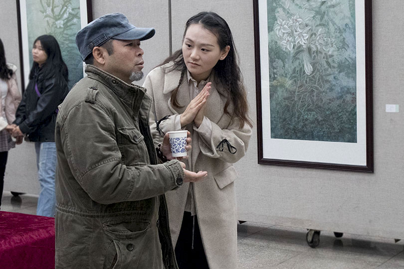 肖瑶的每幅作品都散发着她温婉的气质和谦和低调的态度,作品设色典雅,选材灵动,风格柔美。画中的每一只朱雀,每一朵野花都仿佛是自然的生灵,一花一世界,一叶一菩提,安静而美好。近观作品,细线与色彩的结合产生了儒雅自然、飘逸灵动的视觉魅力。画家赋予作品的情感和娴熟的绘画技巧打动了每一位观者,他们或仔细品味,或拍照留念,吸引了广大美术爱好者前来观赏品评。