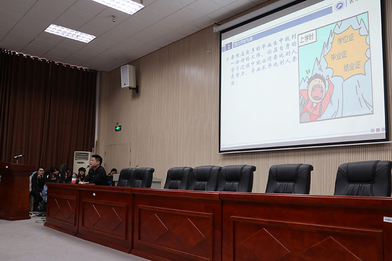 会上,胡鹏从大学专业、爱好、组织管理能力三个方面为大家上了一堂生动的大学教育课。首先,他以绘画专业为例,分析了就业方向,并简要介绍了往届毕业生的升学就业情况。他希望同学们能深入地了解自己的目标对比现有阶段的差距,正确制定好计划,管理好时间,努力提升自己的专业水平,提高核心竞争力。胡鹏还建议大家在大学时光里找到适合自身发展的有益兴趣,丰富课余时间,促进自身的全面发展。此外,胡鹏结合社会现状,希望同学们能提升管理能力与人际交往能力,要求同学们重视基础课程学习,努力考取相应的证书,并建议同学们能尽早地规划自己的未来,找准努力方向,提升自身的实力,为更美好的未来打下坚实基础。