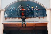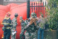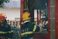 演练现场,两名消防员迅速开启自动喷水系统,压住火势,以达到尽可能快速消除浓烟,以便更好帮助同学逃离现场。而另一侧演示的是跳楼逃生和安全着陆气垫床的标准动作,不时队伍里爆发出阵阵惊叹声。演练最后,浓烟散去,消防车快速驶离现场,演练结束。