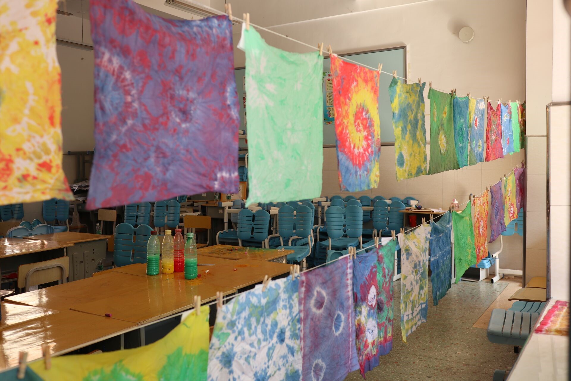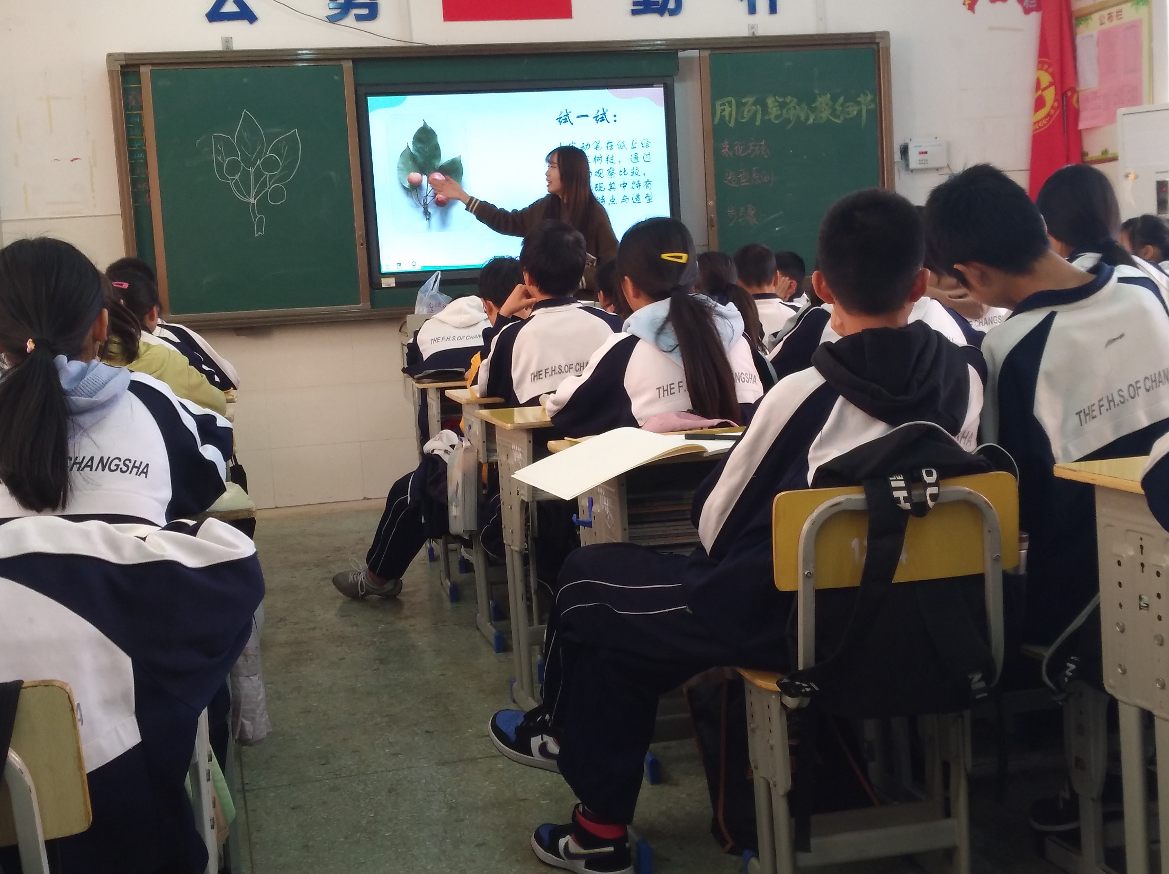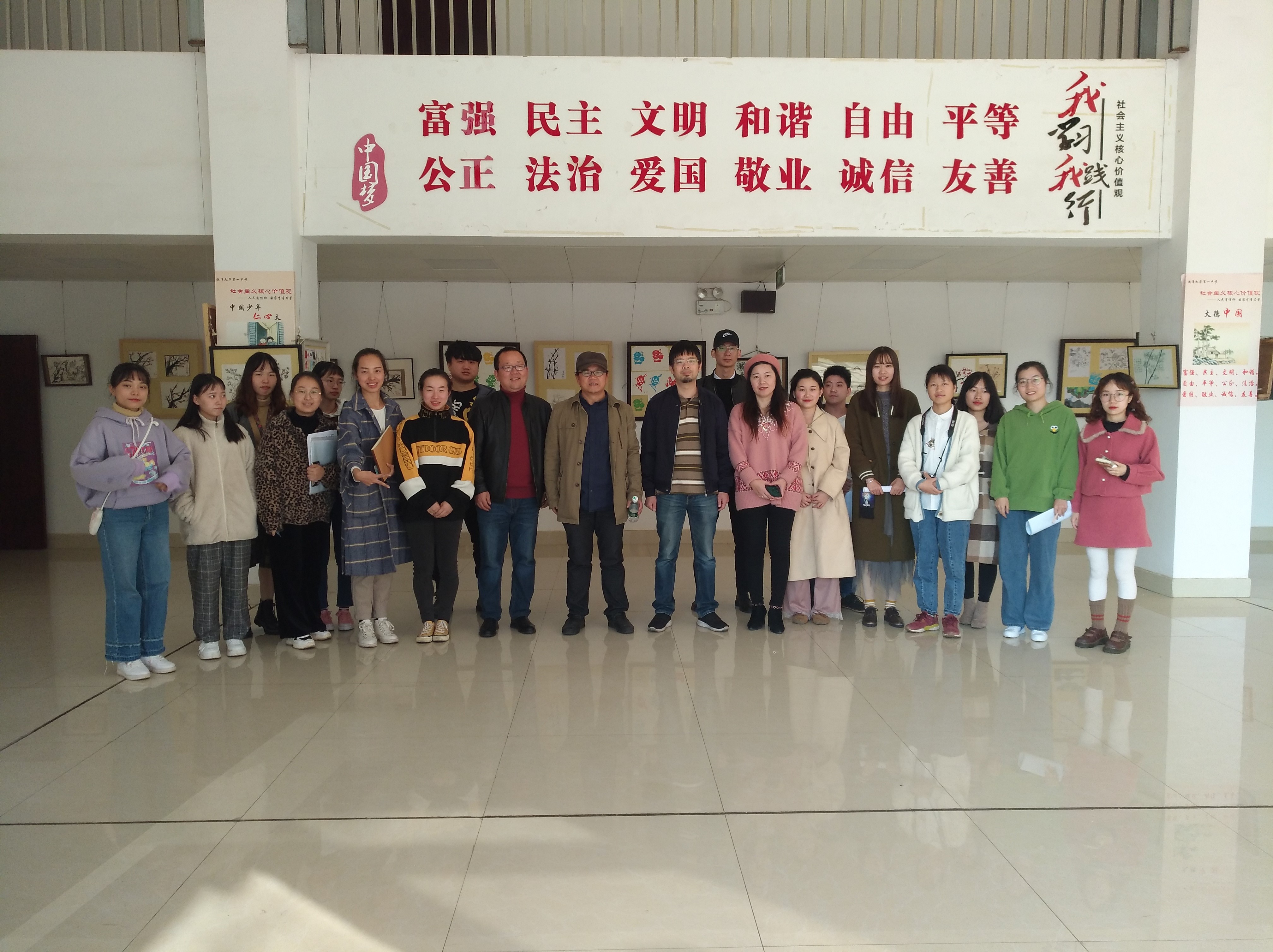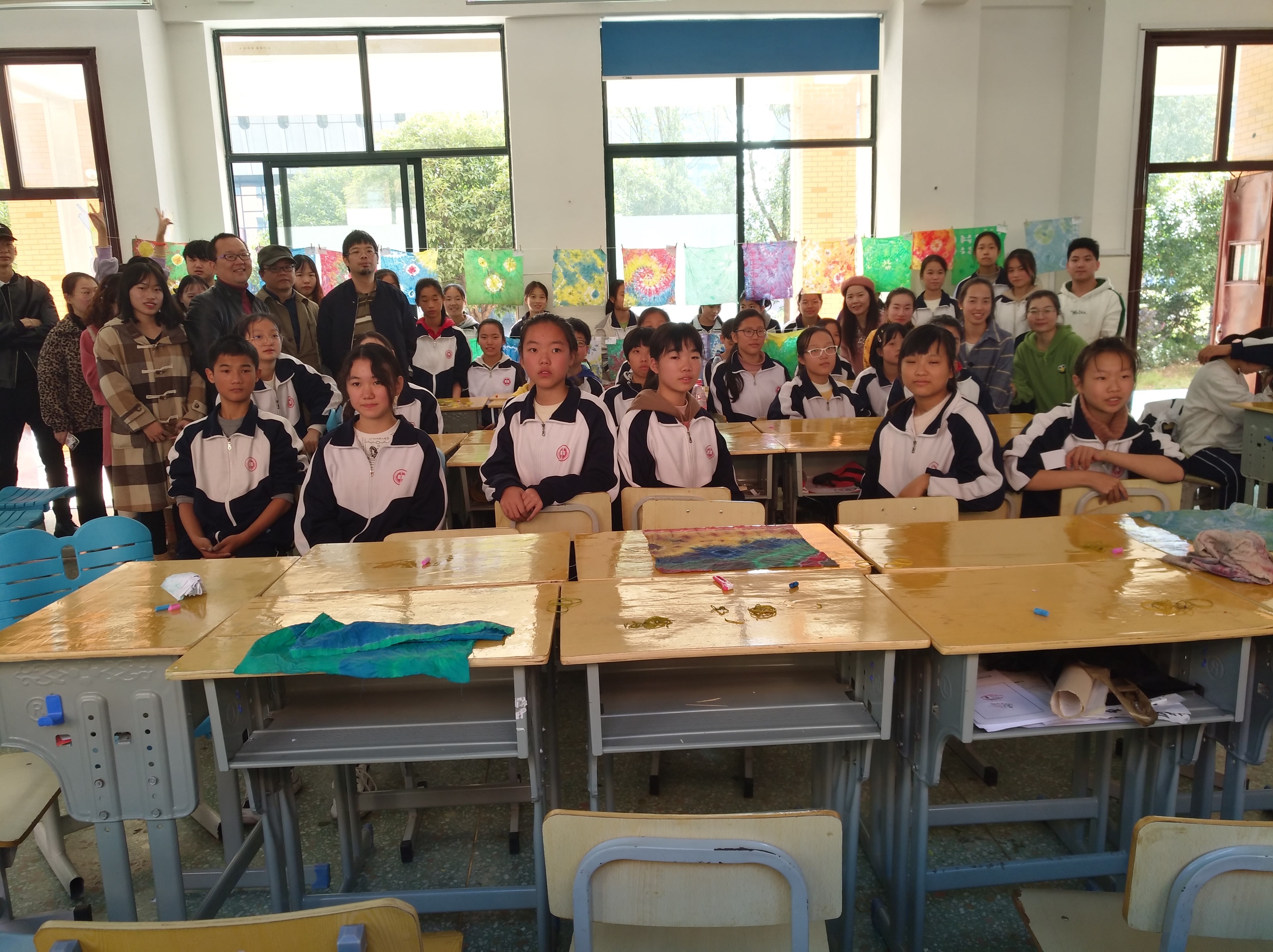 11月21日,湖南科技大学艺术学院副院长赵湘学,美术系主任雷永明,教务办主任从丽侠来到长沙市一中九华中学检查教育实习情况,看望实习学生,听取汇报课,开展座谈,观看美术作品展并合影留念。学院检查人员中午一到九华中学就开始听实习生郭丽莎讲的“非遗”美术兴趣小组课。实习生们将湘西非物质遗产考察的成果应用于课外兴趣小组的实践教学。本次课堂中实习老师讲述了“扎染”的起源、特点,再到具体的制作细节,边讲边示范,步步深入,引导学生构思,指导学生捆扎,染色,拆线。课堂气氛无比活跃,学生兴趣高昂,大家纷纷动手,一幅幅精彩的“扎染”作品展现在课堂上。一块块色彩斑斓的布迎风飞舞,闪烁着靓丽的青春之光。最后,实习老师还请让同学们评选最具创意的作品。这种以兴趣为导向,寓教于乐的课堂,更好地弘扬和传承了中华民族的优秀传统文化。之后,艺术学院的领导和九华中学的老师们又听了实习生杨芸凤的汇报课——用画笔触摸细节。上课一开始,一幅活动的《清明上河图》带学生走入绘画世界,然后又从梵高的流动的笔触中体会艺术的魅力。杨芸凤老师由浅入深、循序渐进的讲解,让中学的美术课堂非常安静,大家都在用心聆听艺术的故事。讲授环节以后,同学们早就跃跃欲试的双手画出了一幅幅富有创意的作品。