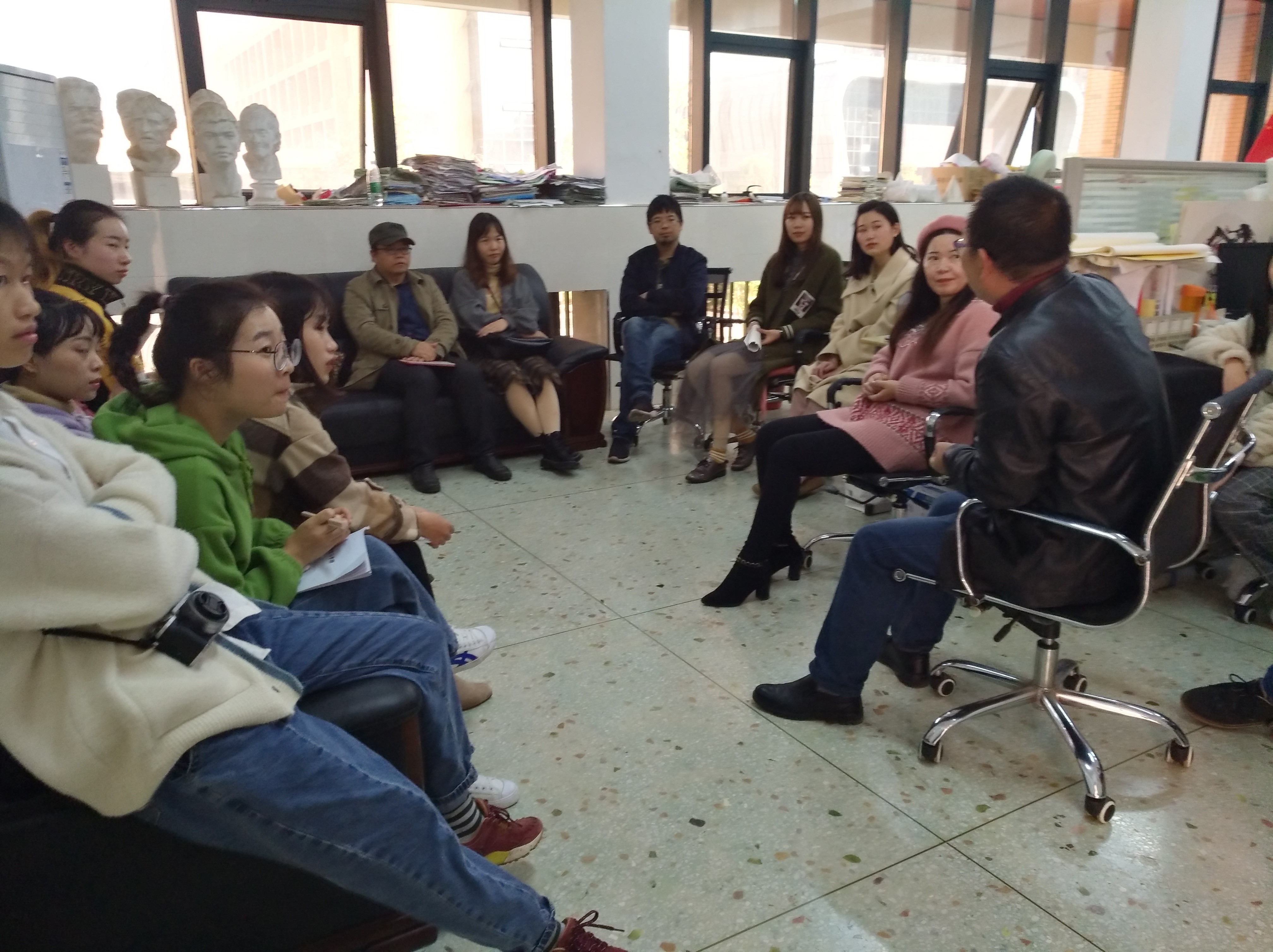 汇报课结束后,由关伟老师主持师生座谈会,会上九华中学黄艳老师总结了实习的整体情况,表示实习生的到来给自己带来了青春活力,大家精心备课,悉心听取评课意见,一堂课比一堂课好。陈婳屿老师对这次非遗课程的学生作品给予赞赏,并鼓励实习的师妹师弟们将来一定会成为优秀的美术教师。赵湘学副院长在发言中表达了对这次实习的充分肯定,并特别指出九华中学非遗兴趣小组课的形式明年可以在其它实习学校开展。同时要求同学们多参与班级管理,要真正融入到学生之中,要深入了解学生的情况,关注学生的成长。用九华中学老教师援疆支教的例子鼓励大家做一名老师要讲奉献,淡泊名利,专心于教育事业。赵院长的语重心长、谆谆教诲赢得实习生的热烈掌声。实习生代表钟秀梅和郭丽莎两位同学表示经过前面七周的实习,对课堂教学有了深刻的认识了解,与班上同学相处融洽,感受到教育事业的快乐,对各位指导老师表达诚挚的感谢。